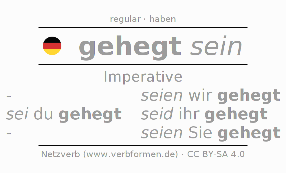 The conjugation of hegen in Imperative Present Imperative Statal Passive is sei (du) gehegt, seien wir gehegt, seid (ihr) gehegt, seien Sie gehegt.The conjugation corresponds to certain grammatical rules. Likewise the requirements for the conjugation of the simple verb forms of hegen in Imperative. Comments ☆