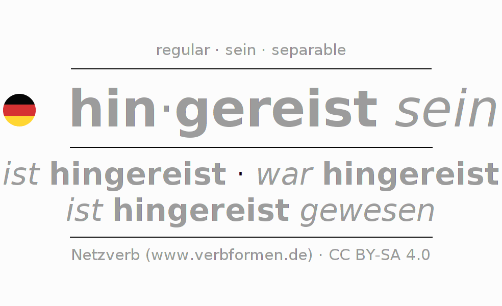 The conjugation of hinreisen in Imperative Present Imperative Statal Passive is sei (du) hingereist, seien wir hingereist, seid (ihr) hingereist, seien Sie hingereist.The conjugation corresponds to certain grammatical rules. Likewise the requirements for the conjugation of the simple verb forms of hinreisen in Imperative. Comments ☆
