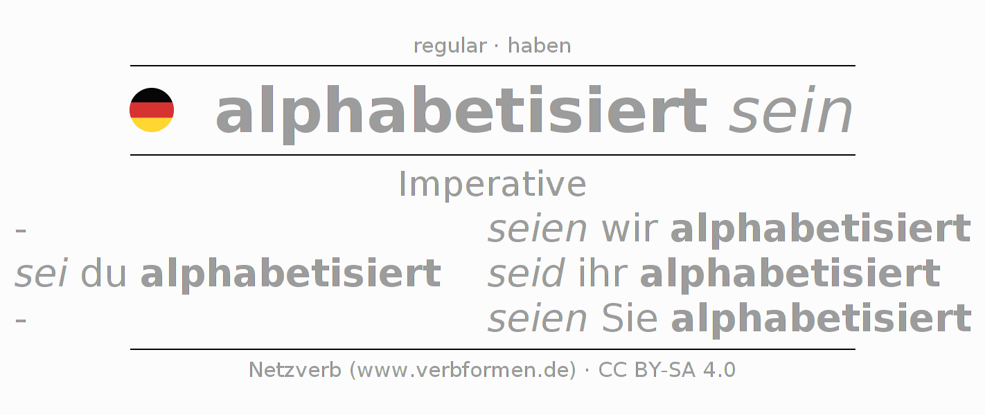 The conjugation of alphabetisieren in Imperative Present Imperative Statal Passive is sei (du) alphabetisiert, seien wir alphabetisiert, seid (ihr) alphabetisiert, seien Sie alphabetisiert.The conjugation corresponds to certain grammatical rules. Likewise the requirements for the conjugation of the simple verb forms of alphabetisieren in Imperative. Comments ☆