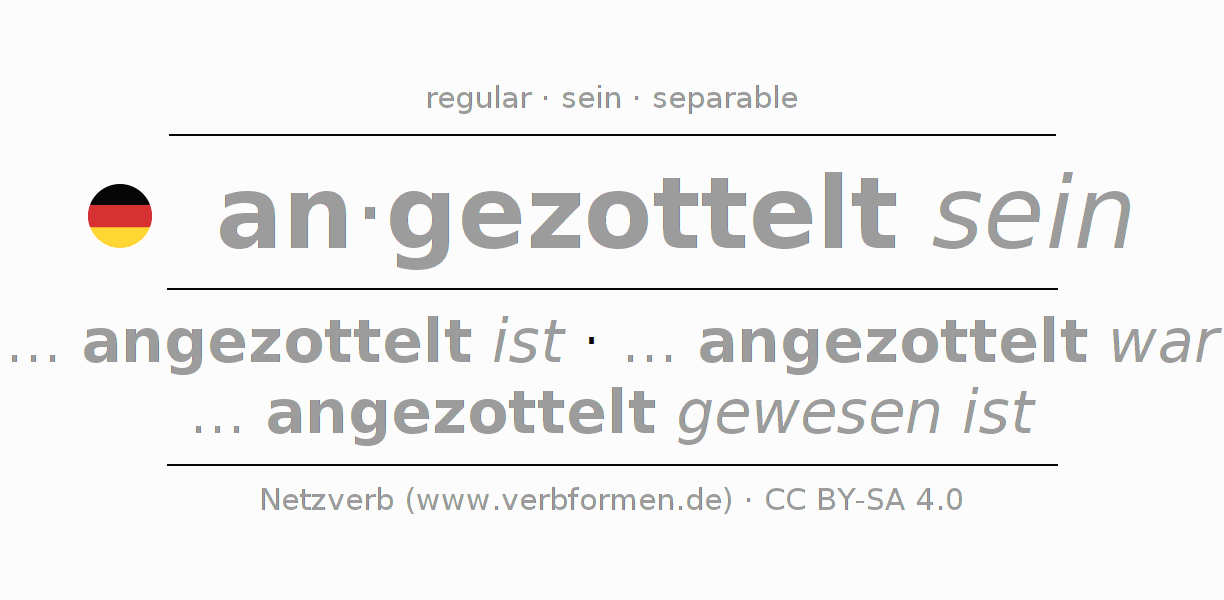 The conjugation of anzotteln in Imperative Present Imperative Statal Passive is sei (du) angezottelt, seien wir angezottelt, seid (ihr) angezottelt, seien Sie angezottelt.The conjugation corresponds to certain grammatical rules. Likewise the requirements for the conjugation of the simple verb forms of anzotteln in Imperative. Comments ☆