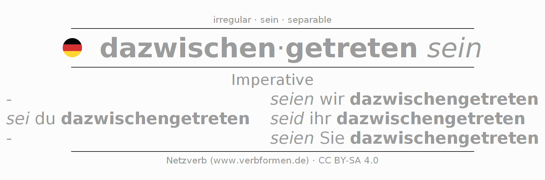 The conjugation of dazwischentreten in Imperative Present Imperative Statal Passive is sei (du) dazwischengetreten, seien wir dazwischengetreten, seid (ihr) dazwischengetreten, seien Sie dazwischengetreten.The conjugation corresponds to certain grammatical rules. Likewise the requirements for the conjugation of the simple verb forms of dazwischentreten in Imperative. Comments ☆
