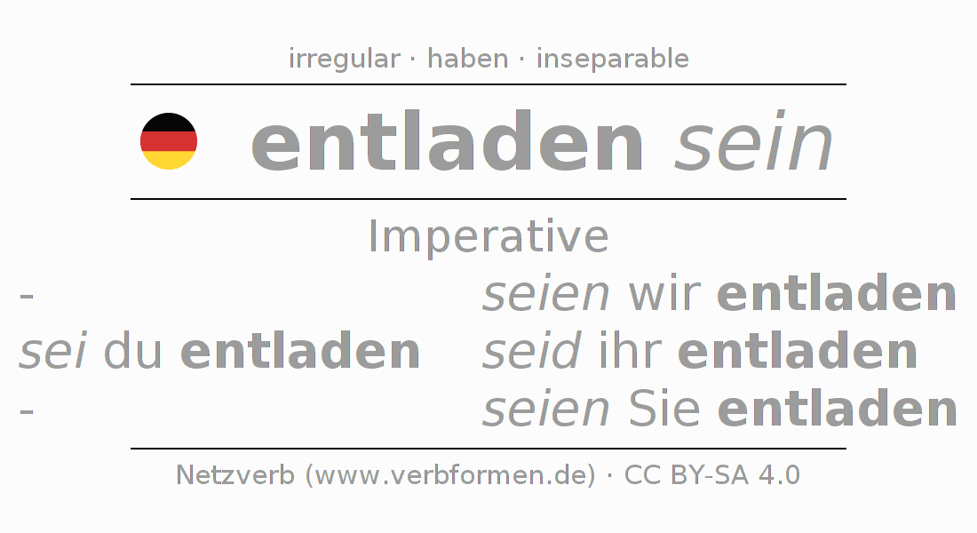 The conjugation of entladen in Imperative Present Imperative Statal Passive is sei (du) entladen, seien wir entladen, seid (ihr) entladen, seien Sie entladen.The conjugation corresponds to certain grammatical rules. Likewise the requirements for the conjugation of the simple verb forms of entladen in Imperative. Comments ☆