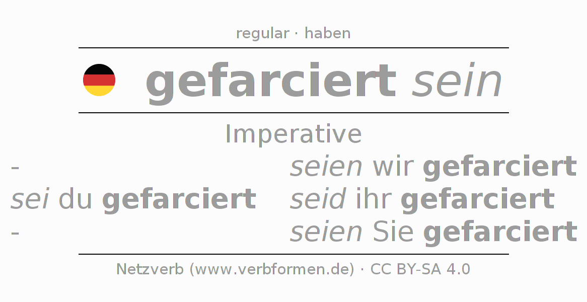 The conjugation of farcieren in Imperative Present Imperative Statal Passive is sei (du) gefarciert, seien wir gefarciert, seid (ihr) gefarciert, seien Sie gefarciert.The conjugation corresponds to certain grammatical rules. Likewise the requirements for the conjugation of the simple verb forms of farcieren in Imperative. Comments ☆