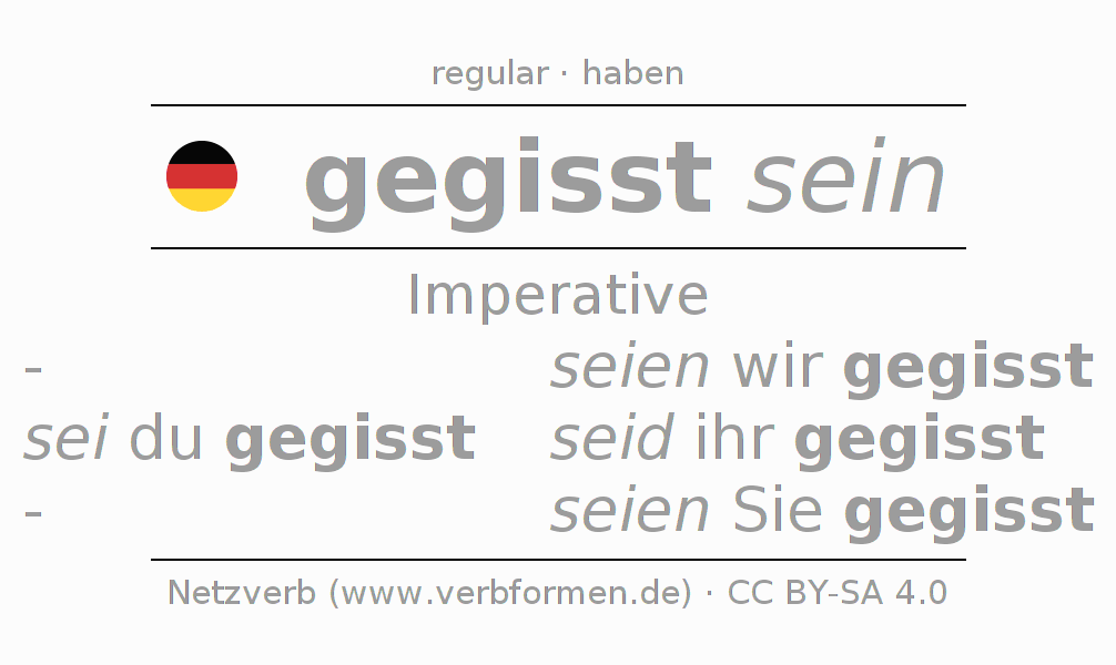 The conjugation of gissen in Imperative Present Imperative Statal Passive is sei (du) gegisst, seien wir gegisst, seid (ihr) gegisst, seien Sie gegisst.The conjugation corresponds to certain grammatical rules. Likewise the requirements for the conjugation of the simple verb forms of gissen in Imperative. Comments ☆