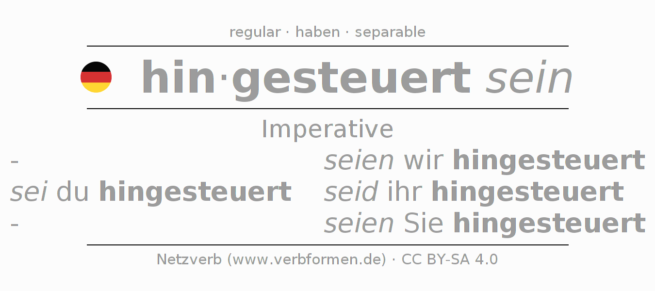 The conjugation of hinsteuern in Imperative Present Imperative Statal Passive is sei (du) hingesteuert, seien wir hingesteuert, seid (ihr) hingesteuert, seien Sie hingesteuert.The conjugation corresponds to certain grammatical rules. Likewise the requirements for the conjugation of the simple verb forms of hinsteuern in Imperative. Comments ☆