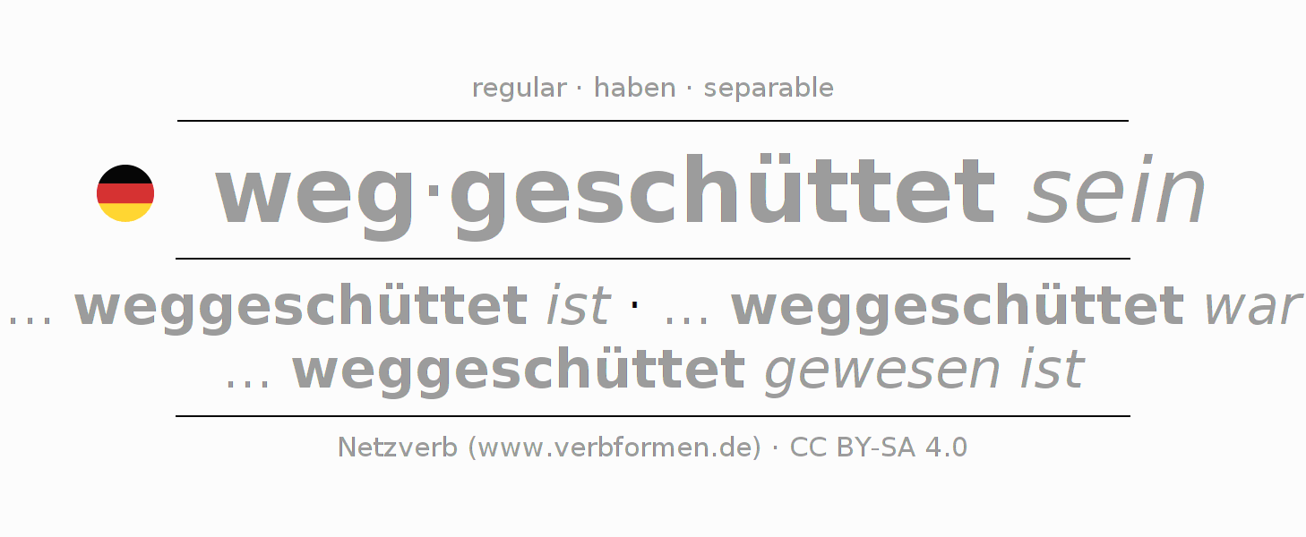 The conjugation of wegschütten in Imperative Present Imperative Statal Passive is sei (du) weggeschüttet, seien wir weggeschüttet, seid (ihr) weggeschüttet, seien Sie weggeschüttet.The conjugation corresponds to certain grammatical rules. Likewise the requirements for the conjugation of the simple verb forms of wegschütten in Imperative. Comments ☆