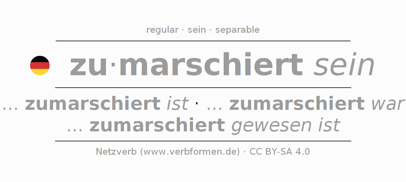 The conjugation of zumarschieren in Imperative Present Imperative Statal Passive is sei (du) zumarschiert, seien wir zumarschiert, seid (ihr) zumarschiert, seien Sie zumarschiert.The conjugation corresponds to certain grammatical rules. Likewise the requirements for the conjugation of the simple verb forms of zumarschieren in Imperative. Comments ☆