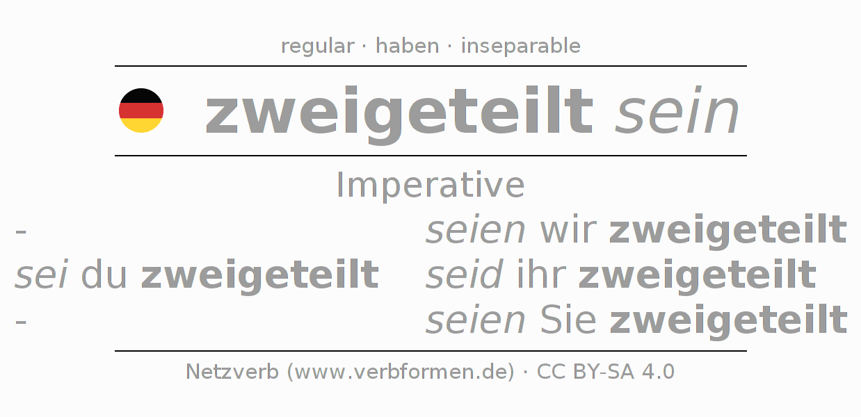 The verb zweiteilen fully conjugated in all persons and numbers in the Imperative Present
