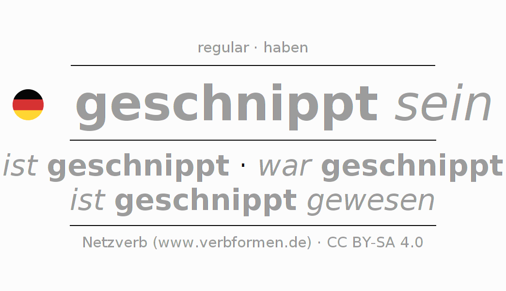 The conjugation of schnippen in Imperative Present Imperative Statal Passive is sei (du) geschnippt, seien wir geschnippt, seid (ihr) geschnippt, seien Sie geschnippt.The conjugation corresponds to certain grammatical rules. Likewise the requirements for the conjugation of the simple verb forms of schnippen in Imperative. Comments ☆