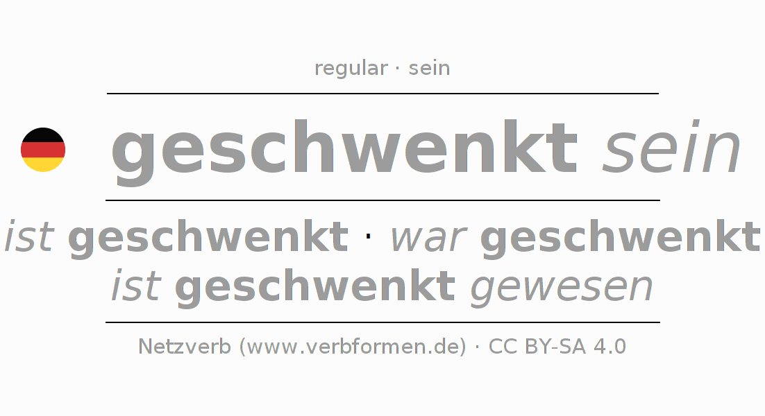 The conjugation of schwenken in Imperative Present Imperative Statal Passive is sei (du) geschwenkt, seien wir geschwenkt, seid (ihr) geschwenkt, seien Sie geschwenkt.The conjugation corresponds to certain grammatical rules. Likewise the requirements for the conjugation of the simple verb forms of schwenken in Imperative. Comments ☆