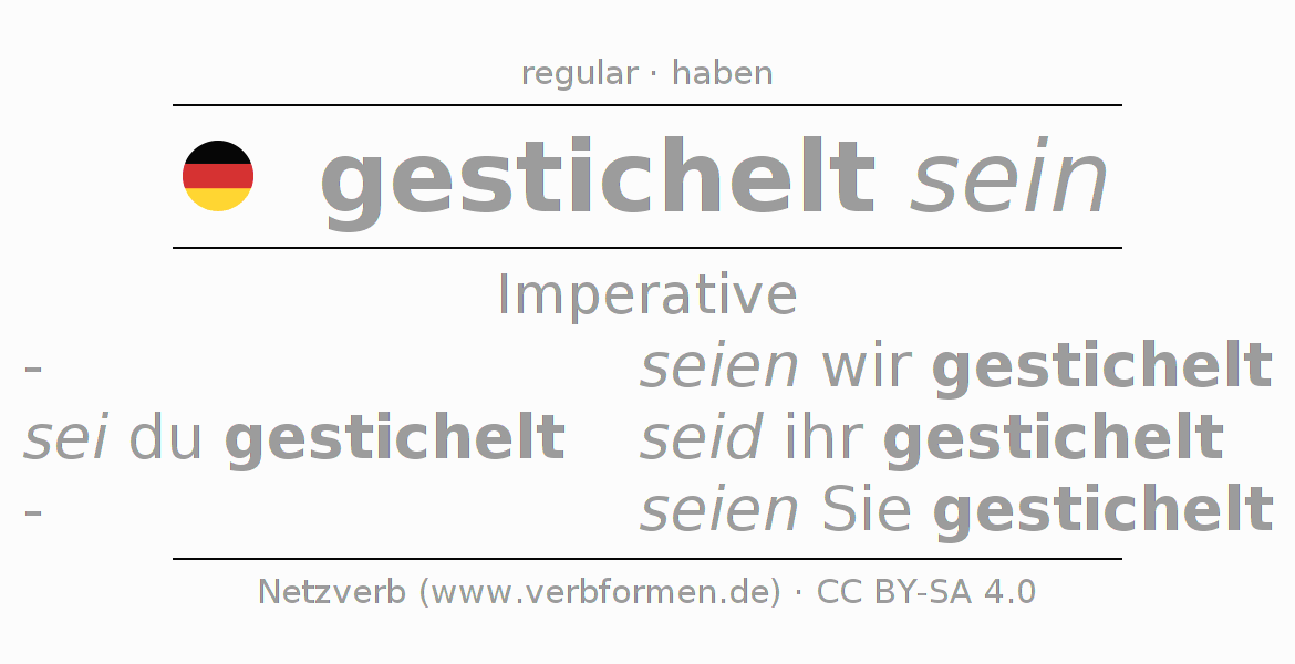 The conjugation of sticheln in Imperative Present Imperative Statal Passive is sei (du) gestichelt, seien wir gestichelt, seid (ihr) gestichelt, seien Sie gestichelt.The conjugation corresponds to certain grammatical rules. Likewise the requirements for the conjugation of the simple verb forms of sticheln in Imperative. Comments ☆