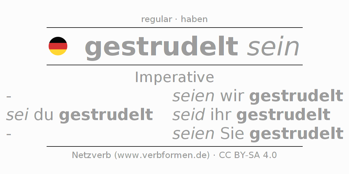 The conjugation of strudeln in Imperative Present Imperative Statal Passive is sei (du) gestrudelt, seien wir gestrudelt, seid (ihr) gestrudelt, seien Sie gestrudelt.The conjugation corresponds to certain grammatical rules. Likewise the requirements for the conjugation of the simple verb forms of strudeln in Imperative. Comments ☆