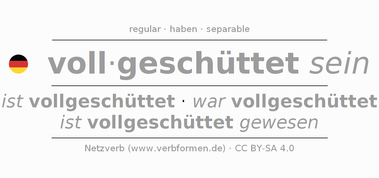 The conjugation of vollschütten in Imperative Present Imperative Statal Passive is sei (du) vollgeschüttet, seien wir vollgeschüttet, seid (ihr) vollgeschüttet, seien Sie vollgeschüttet.The conjugation corresponds to certain grammatical rules. Likewise the requirements for the conjugation of the simple verb forms of vollschütten in Imperative. Comments ☆
