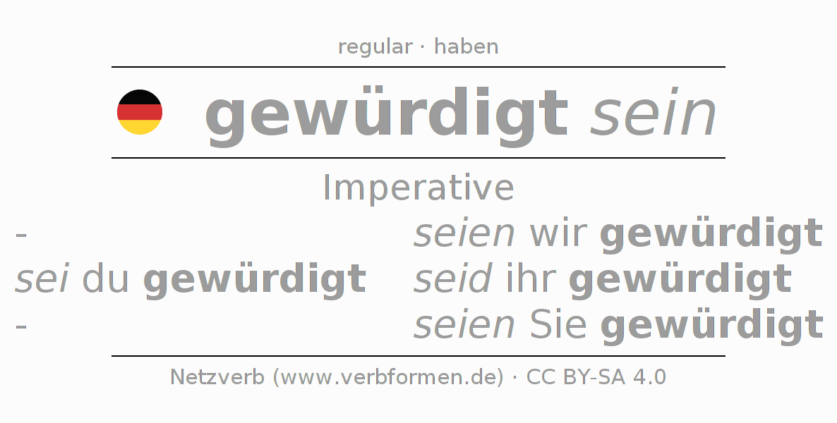 The verb würdigen fully conjugated in all persons and numbers in the Imperative Present