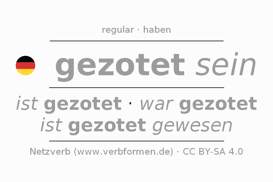 The conjugation of zoten in Imperative Present Imperative Statal Passive is sei (du) gezotet, seien wir gezotet, seid (ihr) gezotet, seien Sie gezotet.The conjugation corresponds to certain grammatical rules. Likewise the requirements for the conjugation of the simple verb forms of zoten in Imperative. Comments ☆