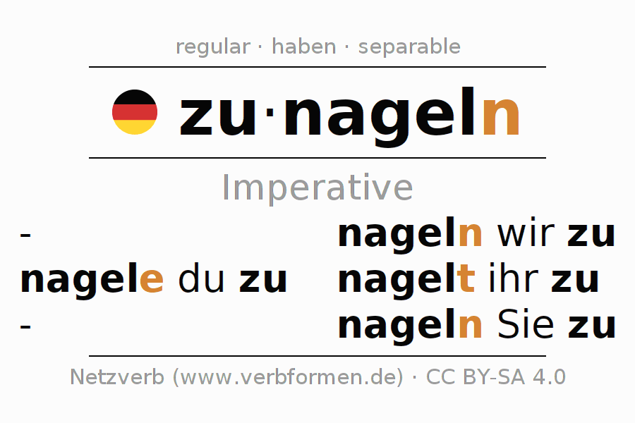 The conjugation of zunageln (board up, nail down) in the imperative is: nag(e)le (du) zu, nageln wir zu, nagelt (ihr) zu, nageln Sie zu. The imperative is formed with the stem of present tense nagel. The endings -e, -n, -t, -n are appended to the stem. The endings in the 1st and 3rd person plural are shortened by e, since the verb ends with -ern. The prefix zu- of zunageln is separated.The personal pronoun is usually omitted in the 2nd person singular.The formation of the forms corresponds to the grammatical rules for the conjugation of the verbs in imperative. Comments ☆