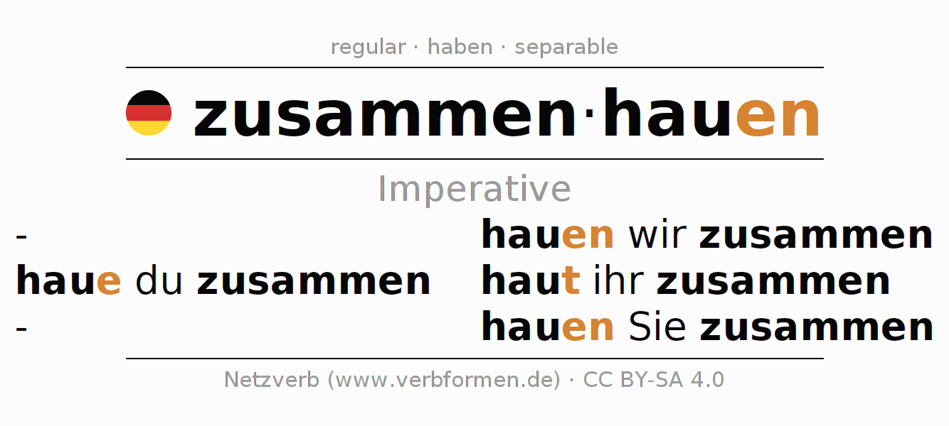 The conjugation of zusammenhauen (beat, beat up) in the imperative is: haue (du) zusammen, hauen wir zusammen, haut (ihr) zusammen, hauen Sie zusammen. The imperative is formed with the stem of present tense hau. The endings -e, -en, -t, -en are appended to the stem. The prefix zusammen- of zusammenhauen is separated.The personal pronoun is usually omitted in the 2nd person singular.The formation of the forms corresponds to the grammatical rules for the conjugation of the verbs in imperative. Comments ☆