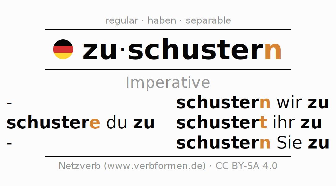 The conjugation of zuschustern (exceed budget, fudge) in the imperative is: schust(e)re (du) zu, schustern wir zu, schustert (ihr) zu, schustern Sie zu. The imperative is formed with the stem of present tense schuster. The endings -e, -n, -t, -n are appended to the stem. The endings in the 1st and 3rd person plural are shortened by e, since the verb ends with -ern. The prefix zu- of zuschustern is separated.The personal pronoun is usually omitted in the 2nd person singular.The formation of the forms corresponds to the grammatical rules for the conjugation of the verbs in imperative. Comments ☆