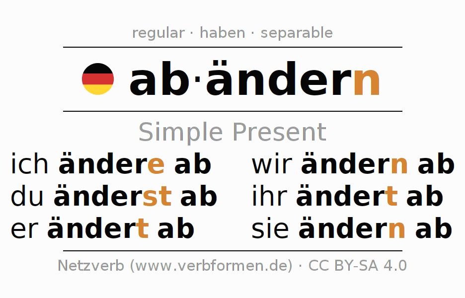 The conjugation of abändern (alter, modify) in the present tense is: ich änd(e)re ab, du änderst ab, er ändert ab, wir ändern ab, ihr ändert ab, sie ändern ab. For this purpose, the endings -e, -st, -t, -n, -t, -n are appended to the stem änder. The endings in the 1st and 3rd person plural are shortened by "e", since the verb ends with -ern. The prefix ab- of abändern is separated.The formation of the forms corresponds to the grammatical rules for the conjugation of the verbs in the present tense. Comments ☆