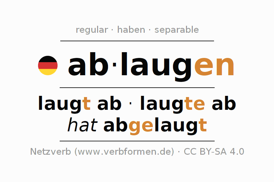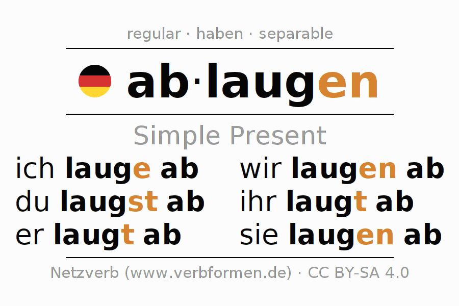 The conjugation of ablaugen (clean with lye, degrease) in the present tense is: ich lauge ab, du laugst ab, er laugt ab, wir laugen ab, ihr laugt ab, sie laugen ab. For this purpose, the endings -e, -st, -t, -en, -t, -en are appended to the stem laug. The prefix ab- of ablaugen is separated.The formation of the forms corresponds to the grammatical rules for the conjugation of the verbs in the present tense. Comments ☆