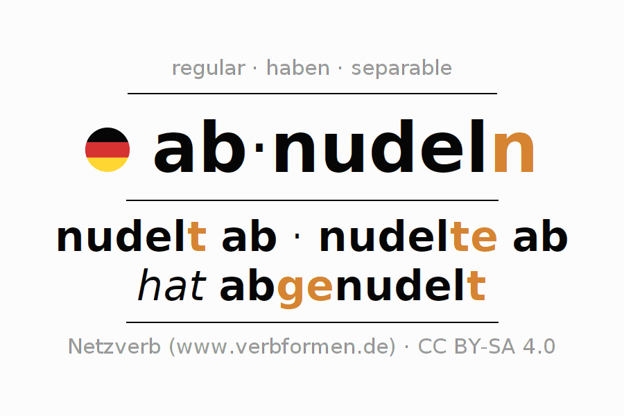 The conjugation of abnudeln (fray, perform blandly) in the present tense is: ich nud(e)le ab, du nudelst ab, er nudelt ab, wir nudeln ab, ihr nudelt ab, sie nudeln ab. For this purpose, the endings -e, -st, -t, -n, -t, -n are appended to the stem nudel. The endings in the 1st and 3rd person plural are shortened by "e", since the verb ends with -eln.In addition, the "e" in the stem can be omitted in the 1st person singular. The prefix ab- of abnudeln is separated.The formation of the forms corresponds to the grammatical rules for the conjugation of the verbs in the present tense. Comments ☆