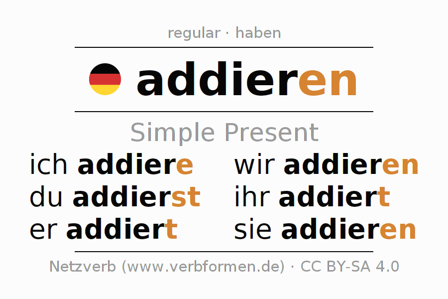 The verb addieren fully conjugated in all persons and numbers in the Present Indicative