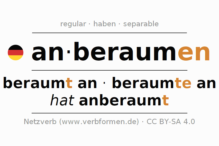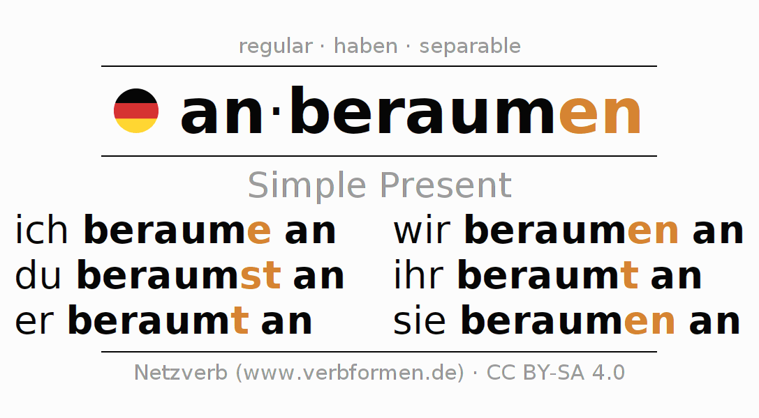 The conjugation of anberaumen (arrange, schedule) in the present tense is: ich beraume an, du beraumst an, er beraumt an, wir beraumen an, ihr beraumt an, sie beraumen an. For this purpose, the endings -e, -st, -t, -en, -t, -en are appended to the stem raum. The prefix an- of anberaumen is separated.The formation of the forms corresponds to the grammatical rules for the conjugation of the verbs in the present tense. Comments ☆