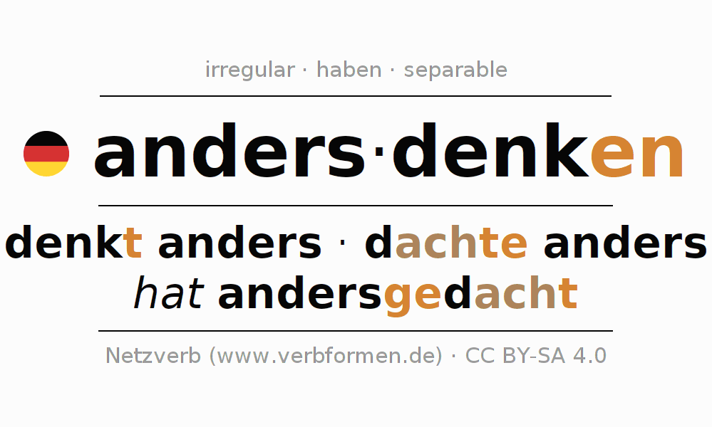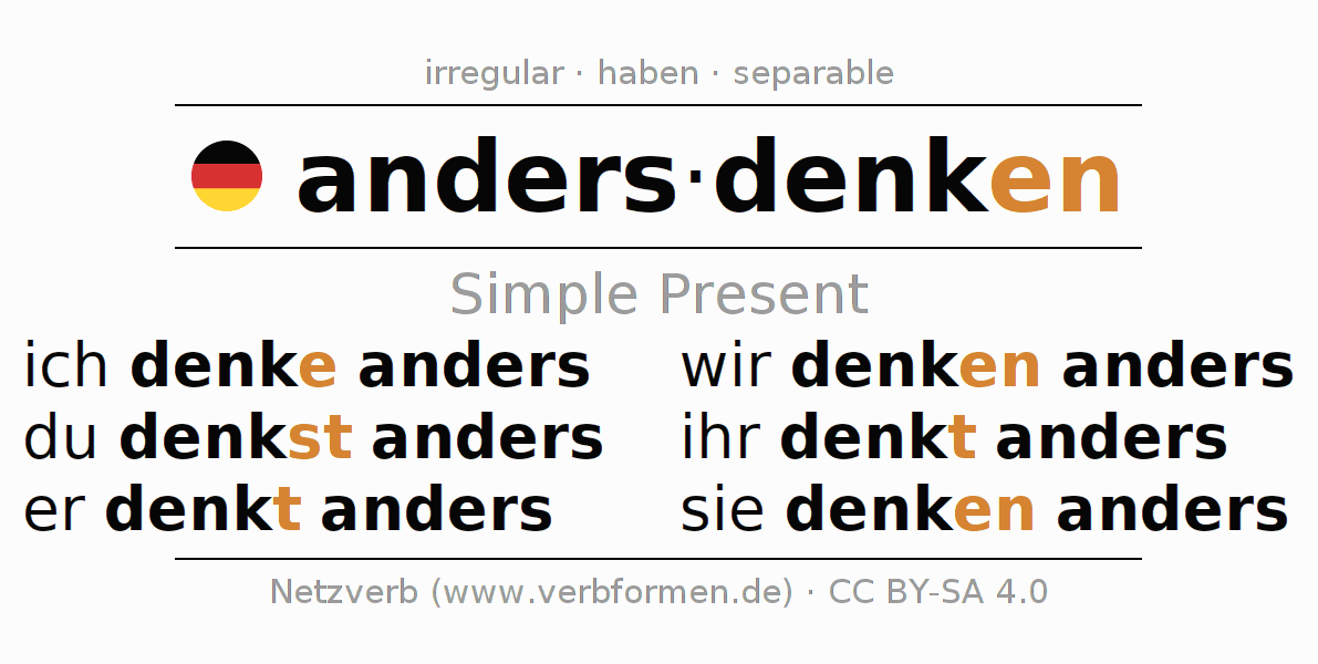 The conjugation of andersdenken (have a different opinion, think differently) in the present tense is: ich denke anders, du denkst anders, er denkt anders, wir denken anders, ihr denkt anders, sie denken anders. For this purpose, the endings -e, -st, -t, -en, -t, -en are appended to the stem denk. The prefix anders- of andersdenken is separated.The formation of the forms corresponds to the grammatical rules for the conjugation of the verbs in the present tense. Comments ☆