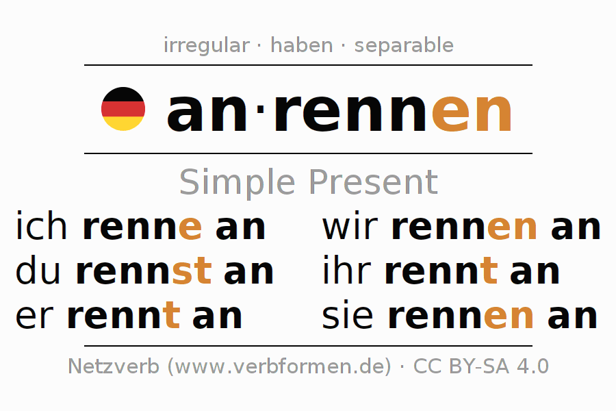 The conjugation of anrennen (charge, collide) in the present tense is: ich renne an, du rennst an, er rennt an, wir rennen an, ihr rennt an, sie rennen an. For this purpose, the endings -e, -st, -t, -en, -t, -en are appended to the stem renn. The prefix an- of anrennen is separated.The formation of the forms corresponds to the grammatical rules for the conjugation of the verbs in the present tense. Comments ☆