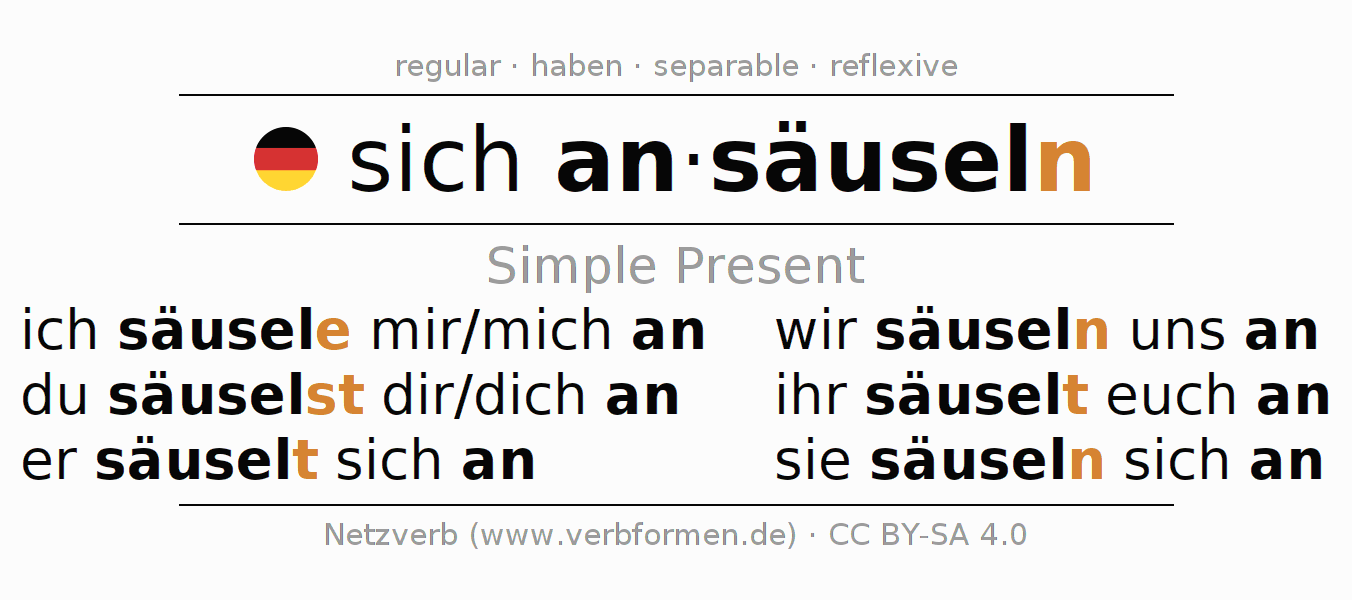 The conjugation of sich ansäuseln (address brusquely, buzz) in the present tense is: ich säus(e)le mir/mich an, du säuselst dir/dich an, er säuselt sich an, wir säuseln uns an, ihr säuselt euch an, sie säuseln sich an. For this purpose, the endings -e, -st, -t, -n, -t, -n are appended to the stem säusel. The endings in the 1st and 3rd person plural are shortened by "e", since the verb ends with -eln.In addition, the "e" in the stem can be omitted in the 1st person singular. The prefix an- of sich ansäuseln is separated.The formation of the forms corresponds to the grammatical rules for the conjugation of the verbs in the present tense. Comments ☆