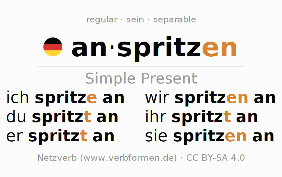 The conjugation of anspritzen (splash, spray) in the present tense is: ich spritze an, du spritzt an, er spritzt an, wir spritzen an, ihr spritzt an, sie spritzen an. For this purpose, the endings -e, -t, -t, -en, -t, -en are appended to the stem spritz. The ending in the second person singular is shortened by "s", since the stem already ends on -z. The prefix an- of anspritzen is separated.The formation of the forms corresponds to the grammatical rules for the conjugation of the verbs in the present tense. Comments ☆