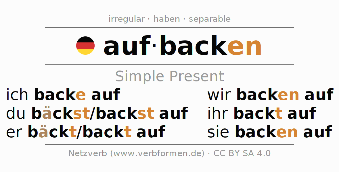 The conjugation of aufbacken (reheat, bake again) in the present tense is: ich backe auf, du bäckst/backst auf, er bäckt/backt auf, wir backen auf, ihr backt auf, sie backen auf. For this purpose, the endings -e, -st, -t, -en, -t, -en are appended to the stem back.As an irregular verb in the 2nd and 3rd person singular the changed present stem bäck/back- is used. The prefix auf- of aufbacken is separated.The formation of the forms corresponds to the grammatical rules for the conjugation of the verbs in the present tense. Comments ☆
