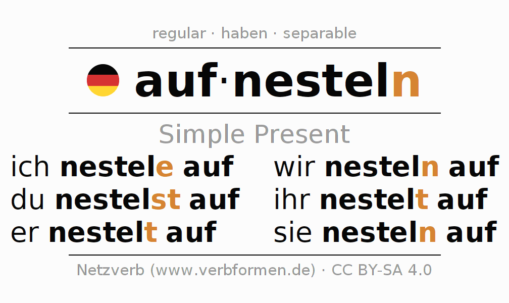 The conjugation of aufnesteln (unfasten, unlock) in the present tense is: ich nest(e)le auf, du nestelst auf, er nestelt auf, wir nesteln auf, ihr nestelt auf, sie nesteln auf. For this purpose, the endings -e, -st, -t, -n, -t, -n are appended to the stem nestel. The endings in the 1st and 3rd person plural are shortened by "e", since the verb ends with -eln.In addition, the "e" in the stem can be omitted in the 1st person singular. The prefix auf- of aufnesteln is separated.The formation of the forms corresponds to the grammatical rules for the conjugation of the verbs in the present tense. Comments ☆