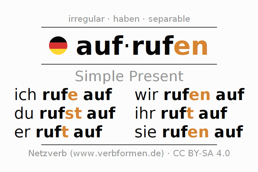 The verb aufrufen fully conjugated in all persons and numbers in the Present Indicative