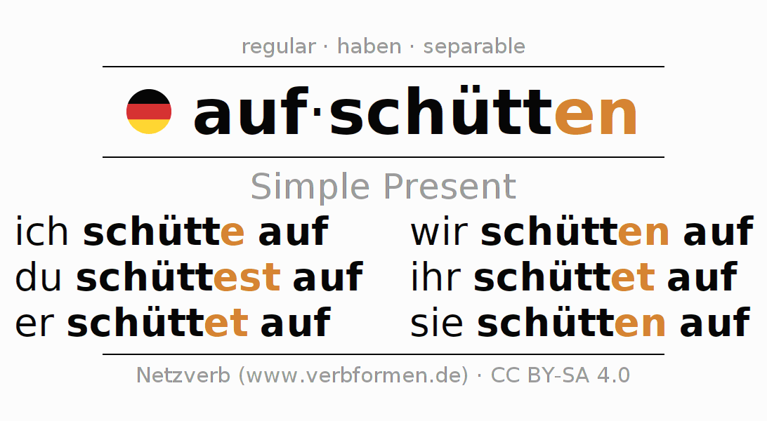 The conjugation of aufschütten (heap, raise) in the present tense is: ich schütte auf, du schüttest auf, er schüttet auf, wir schütten auf, ihr schüttet auf, sie schütten auf. For this purpose, the endings -e, -est, -et, -en, -et, -en are appended to the stem schütt. The endings in the 2nd and 3rd person singular and in the 2nd person plural are extended by "e", as the stem ends on -t. The prefix auf- of aufschütten is separated.The formation of the forms corresponds to the grammatical rules for the conjugation of the verbs in the present tense. Comments ☆