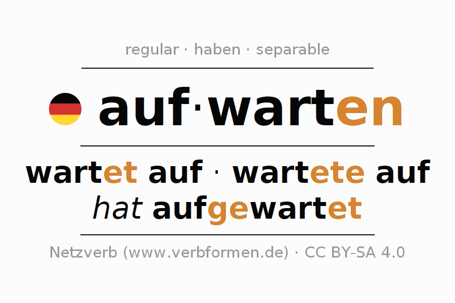 The conjugation of aufwarten (wait on, attend (on)) in the present tense is: ich warte auf, du wartest auf, er wartet auf, wir warten auf, ihr wartet auf, sie warten auf. For this purpose, the endings -e, -est, -et, -en, -et, -en are appended to the stem wart. The endings in the 2nd and 3rd person singular and in the 2nd person plural are extended by "e", as the stem ends on -t. The prefix auf- of aufwarten is separated.The formation of the forms corresponds to the grammatical rules for the conjugation of the verbs in the present tense. Comments ☆