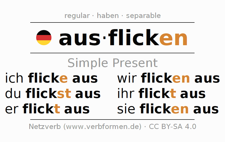 The verb ausflicken fully conjugated in all persons and numbers in the Present Indicative
