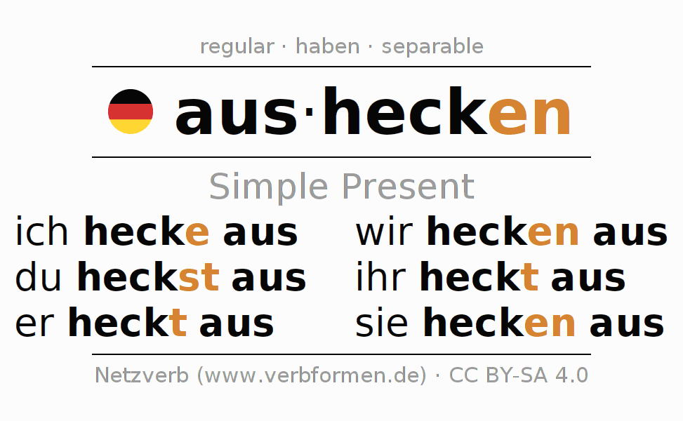 The conjugation of aushecken (concoct, brew) in the present tense is: ich hecke aus, du heckst aus, er heckt aus, wir hecken aus, ihr heckt aus, sie hecken aus. For this purpose, the endings -e, -st, -t, -en, -t, -en are appended to the stem heck. The prefix aus- of aushecken is separated.The formation of the forms corresponds to the grammatical rules for the conjugation of the verbs in the present tense. Comments ☆