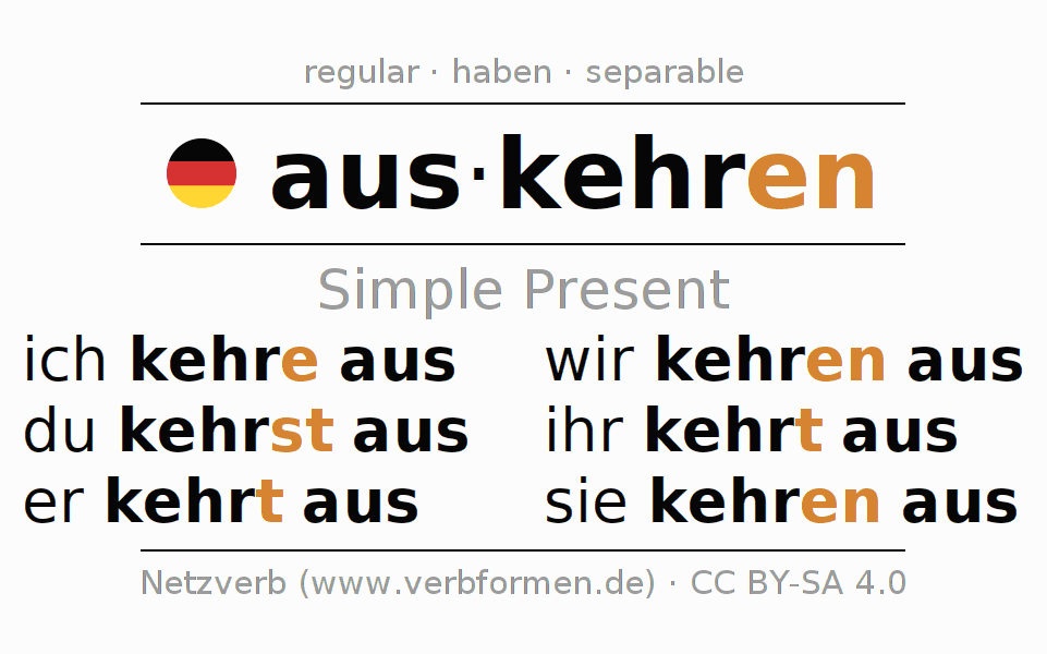 The verb auskehren fully conjugated in all persons and numbers in the Present Indicative