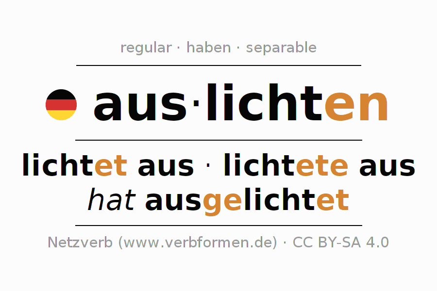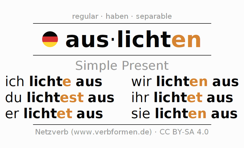 The conjugation of auslichten (prune, thin out) in the present tense is: ich lichte aus, du lichtest aus, er lichtet aus, wir lichten aus, ihr lichtet aus, sie lichten aus. For this purpose, the endings -e, -est, -et, -en, -et, -en are appended to the stem licht. The endings in the 2nd and 3rd person singular and in the 2nd person plural are extended by "e", as the stem ends on -t. The prefix aus- of auslichten is separated.The formation of the forms corresponds to the grammatical rules for the conjugation of the verbs in the present tense. Comments ☆