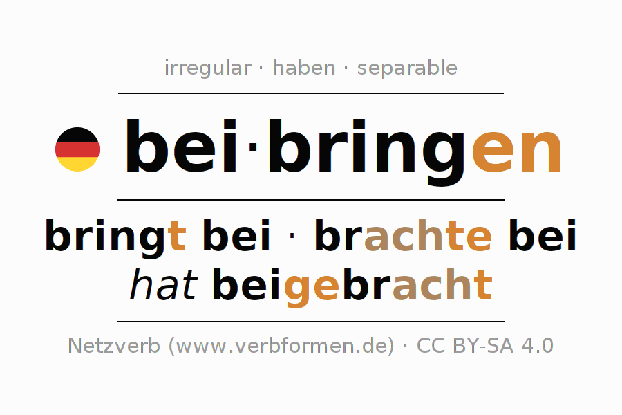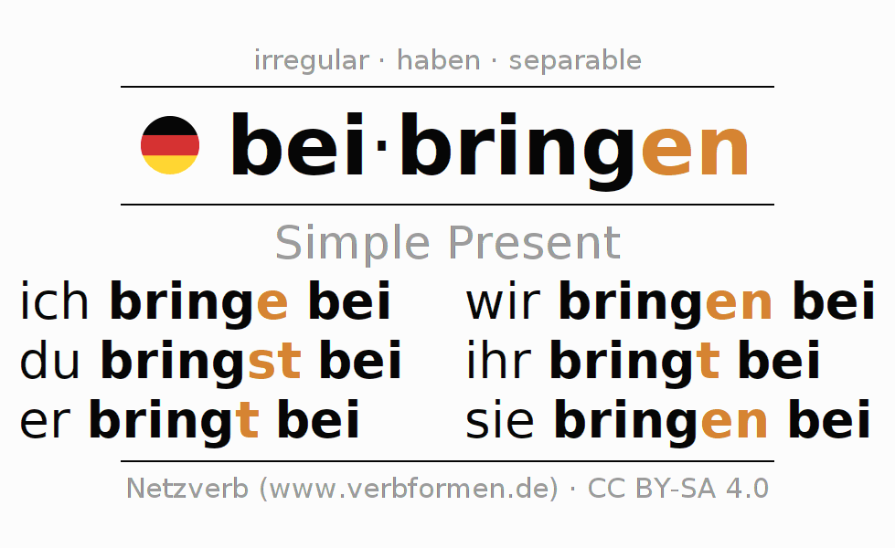 The conjugation of beibringen (teach, provide) in the present tense is: ich bringe bei, du bringst bei, er bringt bei, wir bringen bei, ihr bringt bei, sie bringen bei. For this purpose, the endings -e, -st, -t, -en, -t, -en are appended to the stem bring. The prefix bei- of beibringen is separated.The formation of the forms corresponds to the grammatical rules for the conjugation of the verbs in the present tense. Comments ☆