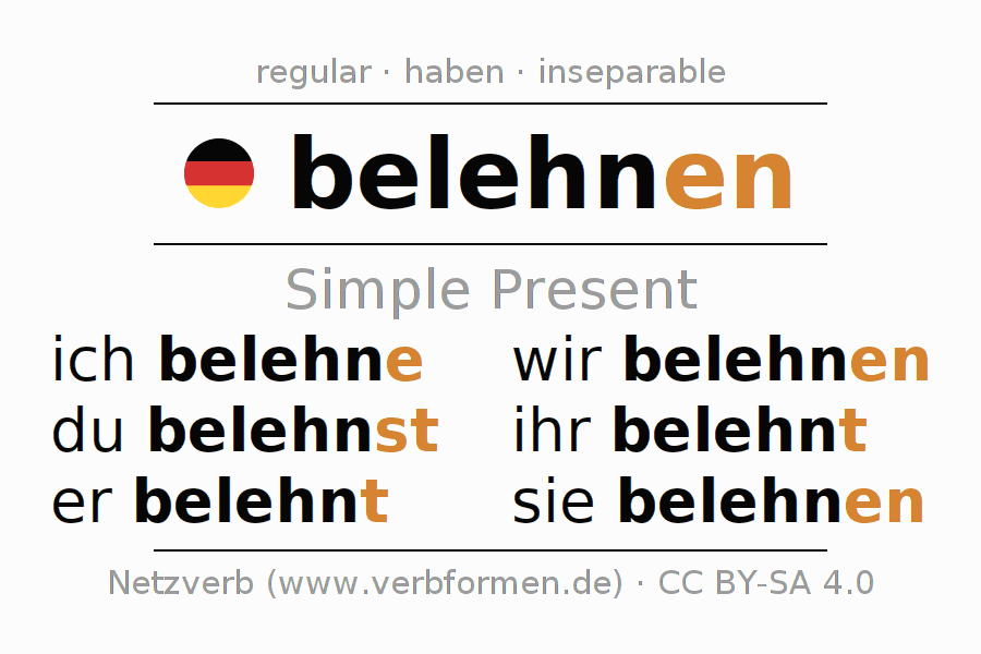 The verb belehnen fully conjugated in all persons and numbers in the Present Indicative