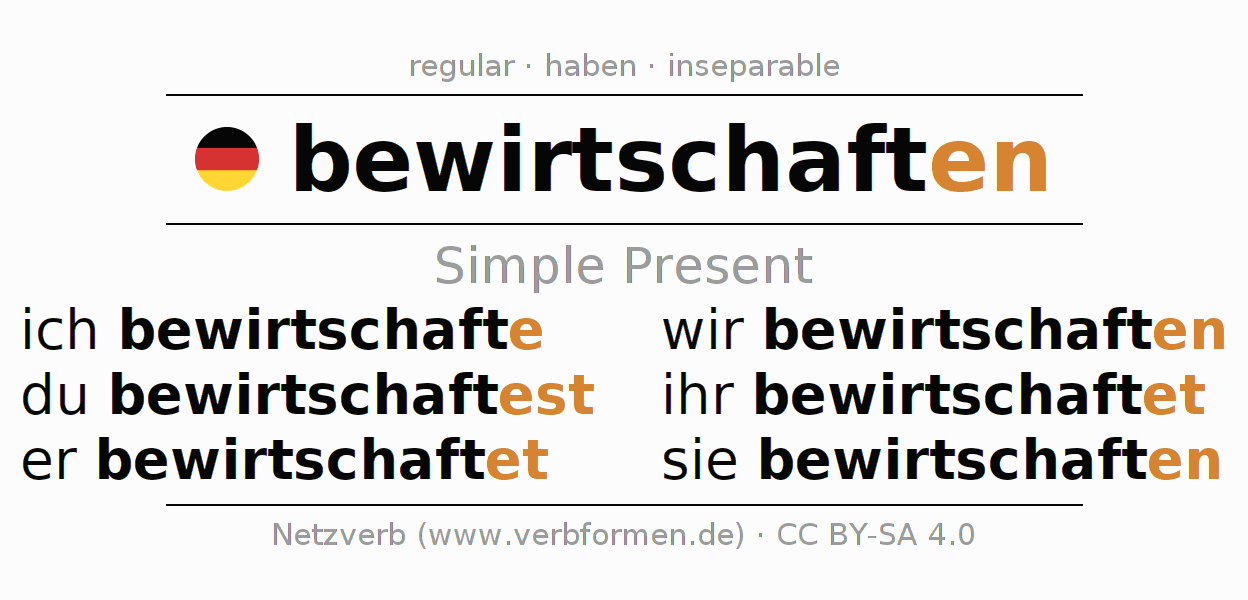 The conjugation of bewirtschaften (manage, administer) in the present tense is: ich bewirtschafte, du bewirtschaftest, er bewirtschaftet, wir bewirtschaften, ihr bewirtschaftet, sie bewirtschaften. For this purpose, the endings -e, -est, -et, -en, -et, -en are appended to the stem wirtschaft. The endings in the 2nd and 3rd person singular and in the 2nd person plural are extended by "e", as the stem ends on -t. The formation of the forms corresponds to the grammatical rules for the conjugation of the verbs in the present tense. Comments ☆