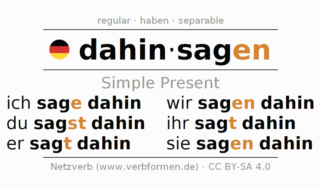 The verb dahinsagen fully conjugated in all persons and numbers in the Present Indicative