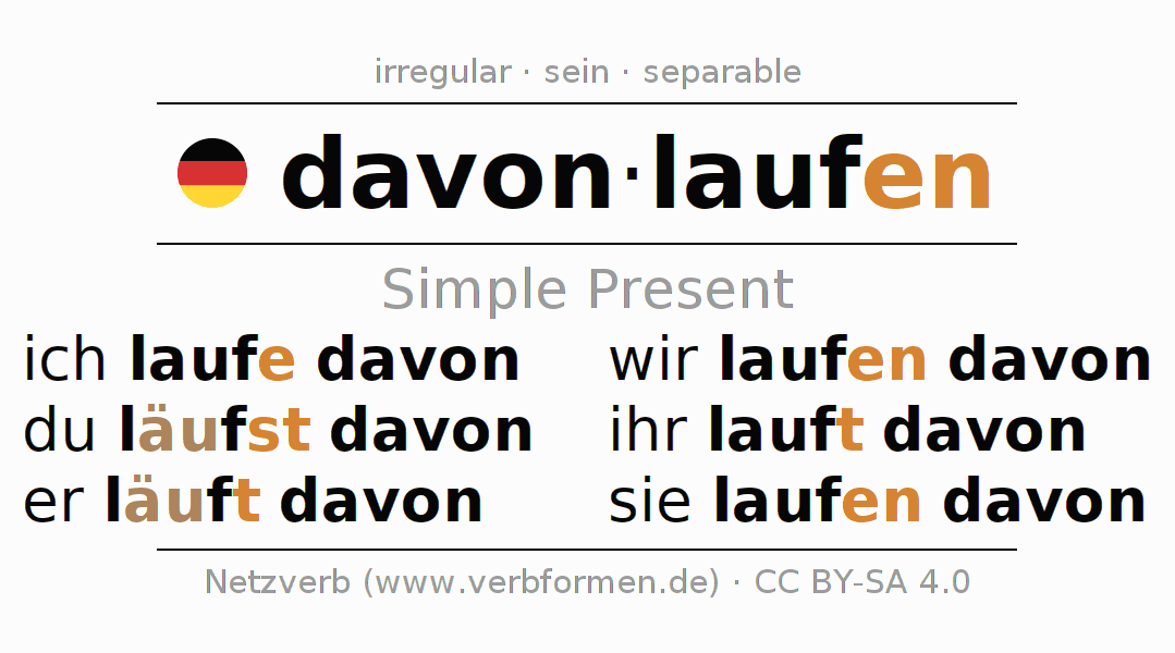 The conjugation of davonlaufen (run away, run away (from)) in the present tense is: ich laufe davon, du läufst davon, er läuft davon, wir laufen davon, ihr lauft davon, sie laufen davon. For this purpose, the endings -e, -st, -t, -en, -t, -en are appended to the stem lauf.As an irregular verb in the 2nd and 3rd person singular the changed present stem läuf- is used. The prefix davon- of davonlaufen is separated.The formation of the forms corresponds to the grammatical rules for the conjugation of the verbs in the present tense. Comments ☆
