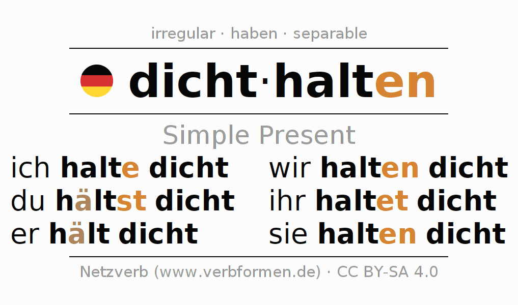 The conjugation of dichthalten (keep mum, hold one's tongue) in the present tense is: ich halte dicht, du hältst dicht, er hält dicht, wir halten dicht, ihr haltet dicht, sie halten dicht. For this purpose, the endings -e, -st, -, -en, -et, -en are appended to the stem halt.As an irregular verb in the 2nd and 3rd person singular the changed present stem hält- is used. The ending in the second person plural is extended by "e", since the stem ends on -t. In the 3rd person singular, the -t of the ending coincides with the stem, so there is no ending. The prefix dicht- of dichthalten is separated.The formation of the forms corresponds to the grammatical rules for the conjugation of the verbs in the present tense. Comments ☆