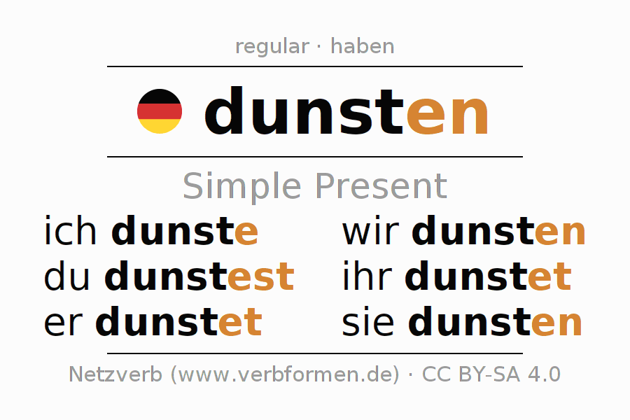 The conjugation of dunsten (steam, await) in the present tense is: ich dunste, du dunstest, er dunstet, wir dunsten, ihr dunstet, sie dunsten. For this purpose, the endings -e, -est, -et, -en, -et, -en are appended to the stem dunst. The endings in the 2nd and 3rd person singular and in the 2nd person plural are extended by "e", as the stem ends on -t. The formation of the forms corresponds to the grammatical rules for the conjugation of the verbs in the present tense. Comments ☆