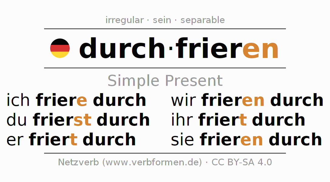 The conjugation of durchfrieren (freeze through, become frozen) in the present tense is: ich friere durch, du frierst durch, er friert durch, wir frieren durch, ihr friert durch, sie frieren durch. For this purpose, the endings -e, -st, -t, -en, -t, -en are appended to the stem frier. The prefix durch- of durchfrieren is separated.The formation of the forms corresponds to the grammatical rules for the conjugation of the verbs in the present tense. Comments ☆