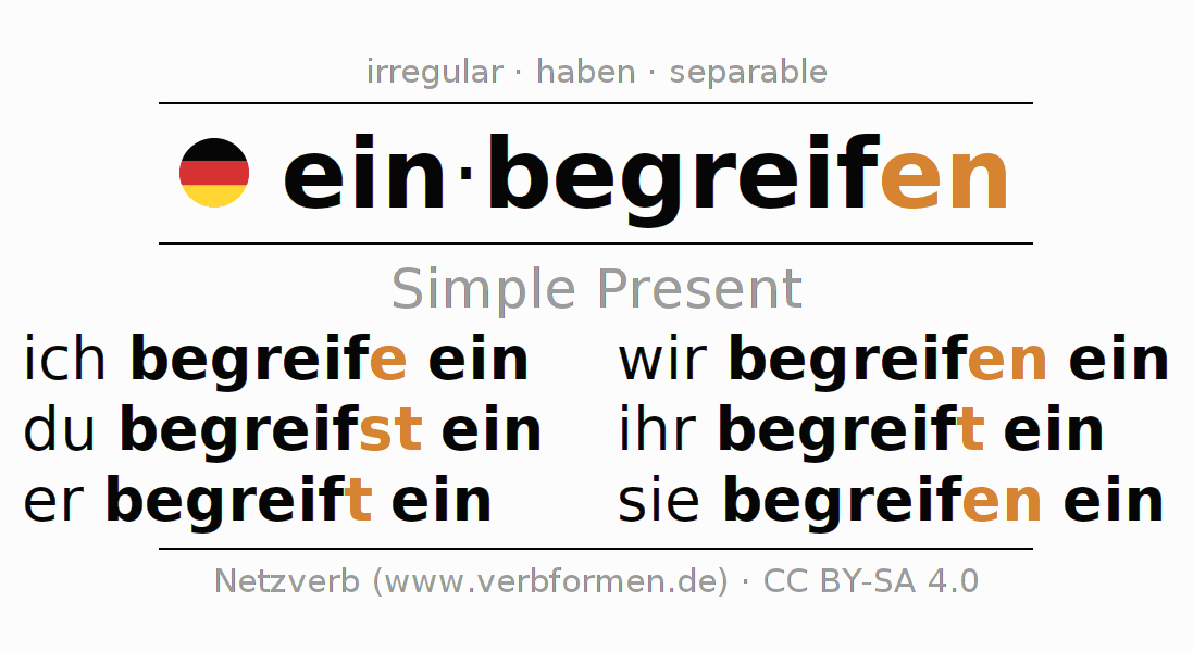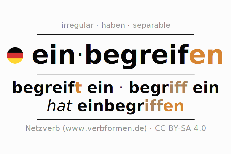 The verb einbegreifen fully conjugated in all persons and numbers in the Present Indicative