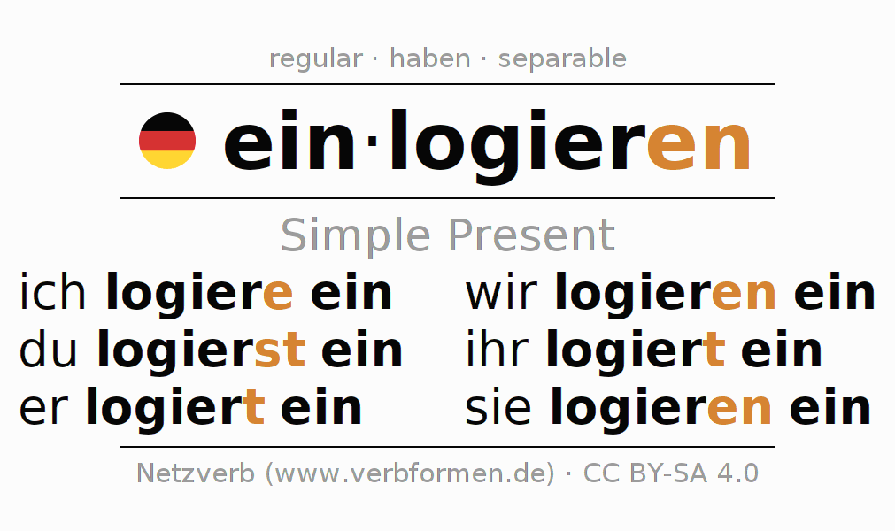 The conjugation of einlogieren (accommodate, stay) in the present tense is: ich logiere ein, du logierst ein, er logiert ein, wir logieren ein, ihr logiert ein, sie logieren ein. For this purpose, the endings -e, -st, -t, -en, -t, -en are appended to the stem logier. The prefix ein- of einlogieren is separated.The formation of the forms corresponds to the grammatical rules for the conjugation of the verbs in the present tense. Comments ☆